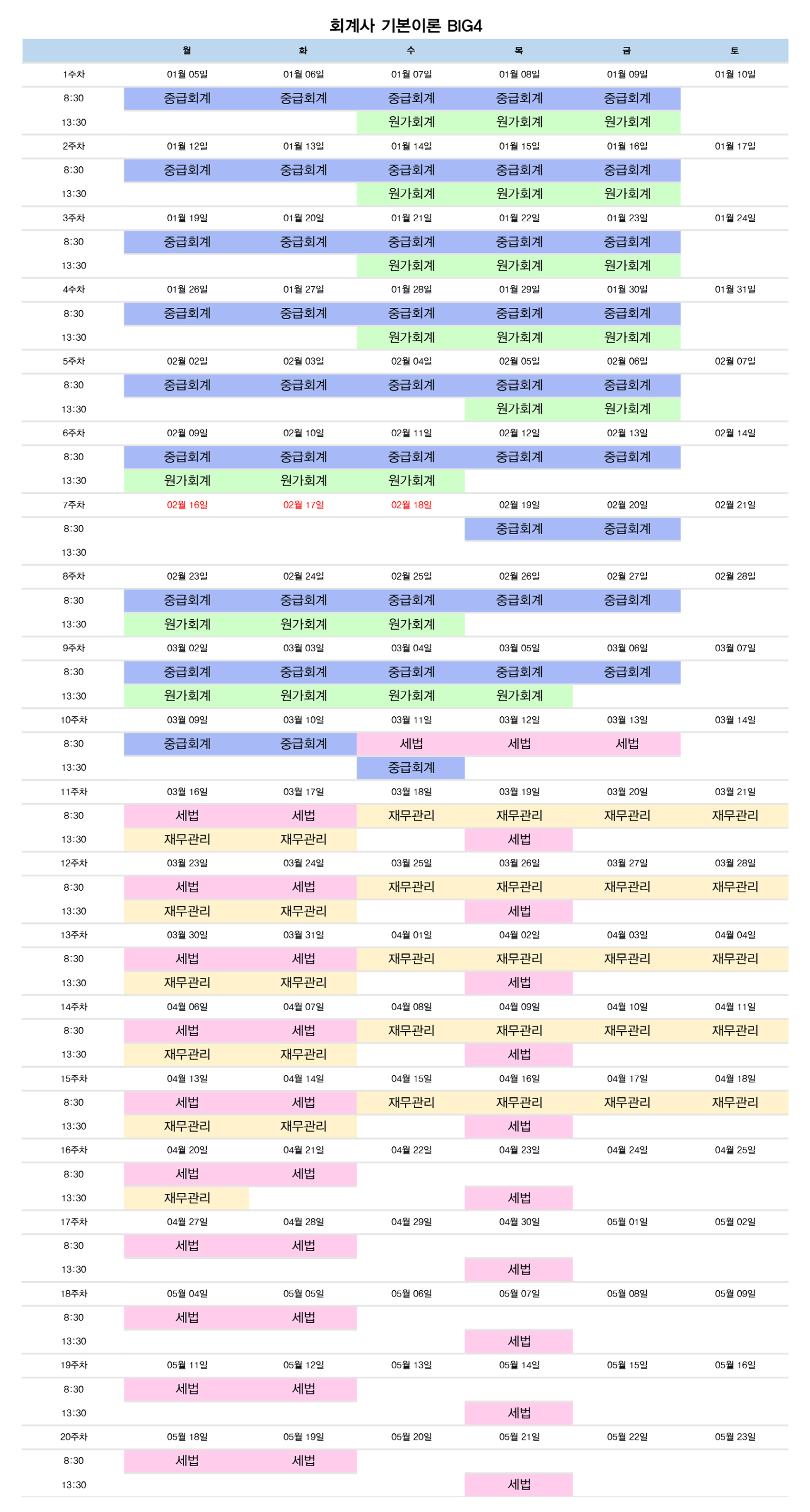 2027년 대비 회계사 기본이론 BIG4 종합반 시간표입니다